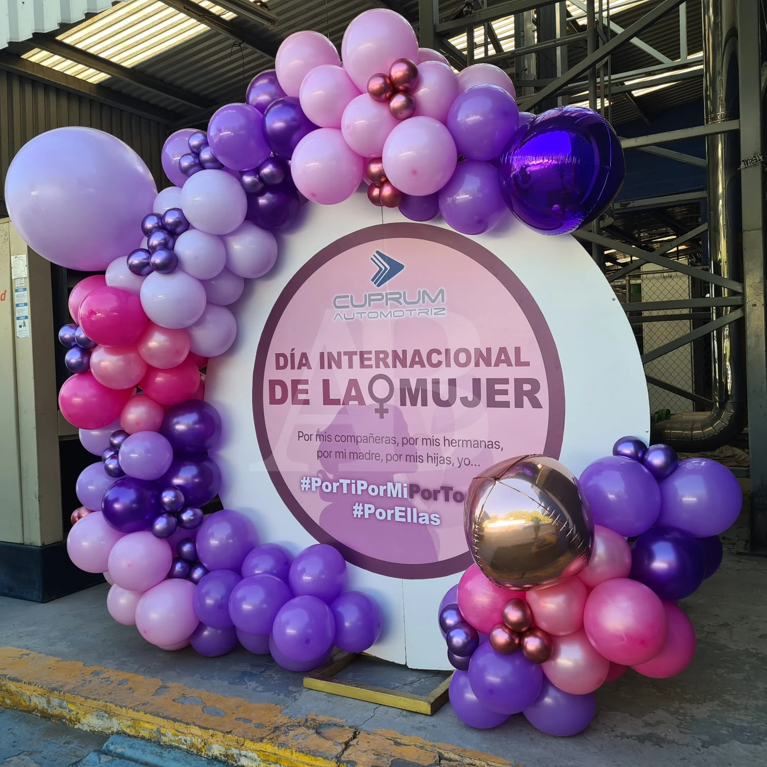 Elaborado con globo de látex tejido orgánico moderno dando movimiento y frescura , montado en la periferia de un back circular con vinil auto adherible personalizado. 1.80 cm de diámetro