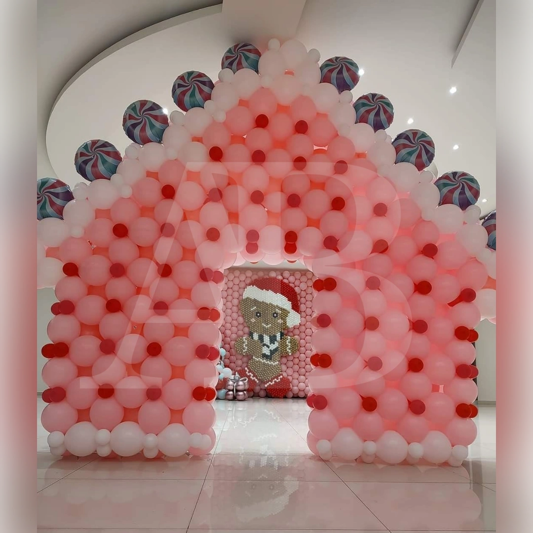 Casita de jengibre realizada con globo látex estandarizando tamaños y colores y globo metálico en la parte superior. Medida: 3 metros de alto x 3 metros de ancho