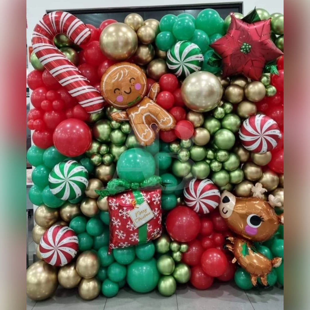 Pared realizada con globo látex con variedad de colores alusivos a la temática , y globos metálicos de distintas figuras navideñas. Medida: 3m x 3m