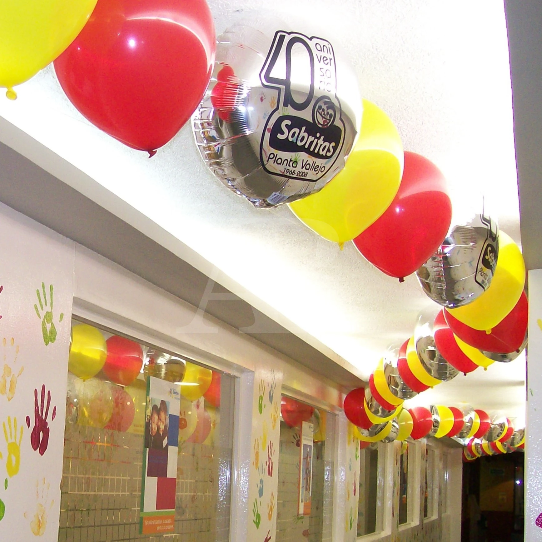 Tira de globos para decorara pasillos. 2 globos de látex color a elegir y un globo metálico impreso con logotipo a una cara y una tinta rellenos con gas helio.